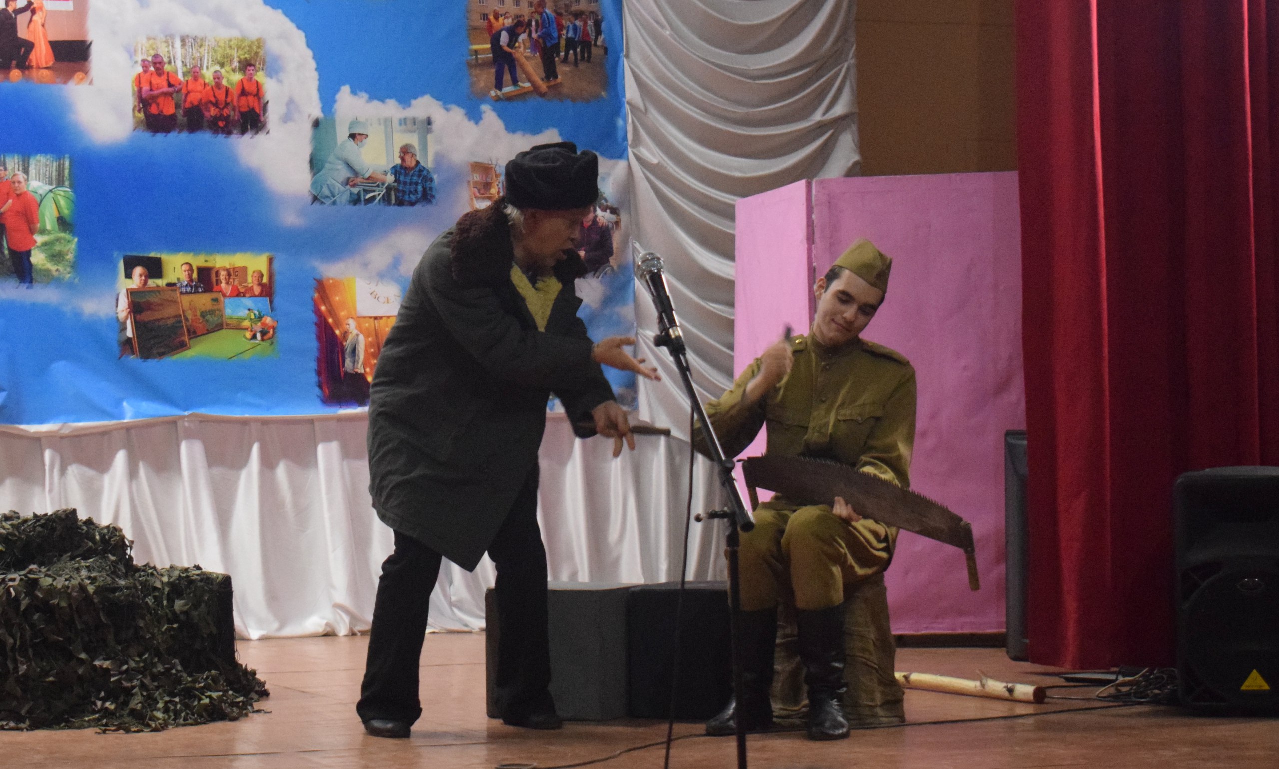 — Тёркин – это подарок жителям этого дома ко Дню Победы. Мы были здесь совсем недавно, в день выборов и показывали спектакль по творчеству В.Высоцкого «За меня другие отпоют все песни». В тот день, конечно, условия были не очень комфортными – все помещения были опечатаны и нам пришлось выступать в фойе перед столовой. Но это не остановило ни актёров, ни зрителей.Спектакль очень понравился. В тот день и завязалась наша дружба с обитателями дома престарелых и инвалидов и с замечательной женщиной, культорганизатором Еленой Леонтьевой, которая и организовывала наши поездки, помогала нам и всячески поддерживала. Сегодняшний спектакль – о войне, о фронтовых дорогах, буднях и подвигах.